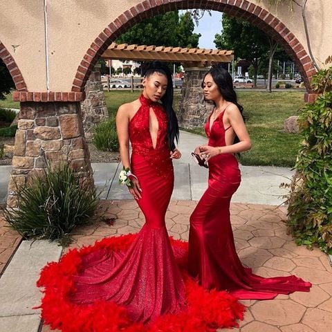 A stunning custom red feather prom dress, featuring a flattering A-line halter neckline silhouette, delicate lace appliques, and a plunging V-neckline. The dress is crafted from luxurious spandex fabric, ensuring a comfortable and elegant fit. The open back design adds a touch of allure, while the floor-length skirt gracefully flows with every step. This captivating red dress is perfect for making a memorable entrance at your prom night.
